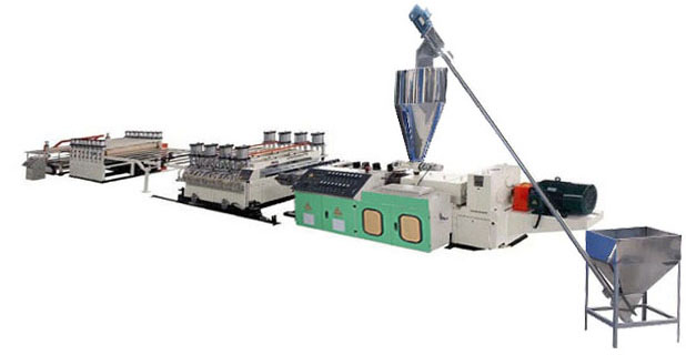 該生產(chǎn)線主要由混料機(jī)、上料機(jī)、雙螺桿擠出機(jī)、擠出板模具、水冷卻定型模具、定型平臺(tái)、八輥牽引機(jī)、機(jī)械手卸料架、落料架、破碎機(jī)、磨粉機(jī)組成。